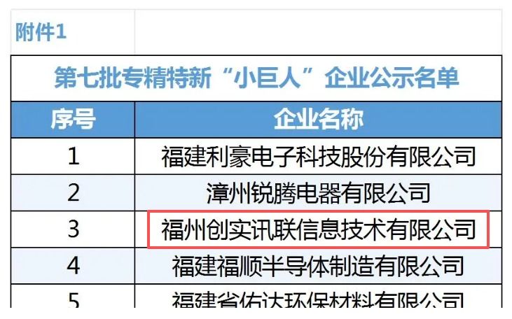 近日,工业和信息化部公示的福建省第七批专精特新"小巨人"企业名单中,福州创实讯联信息技术有限公司成功上榜。